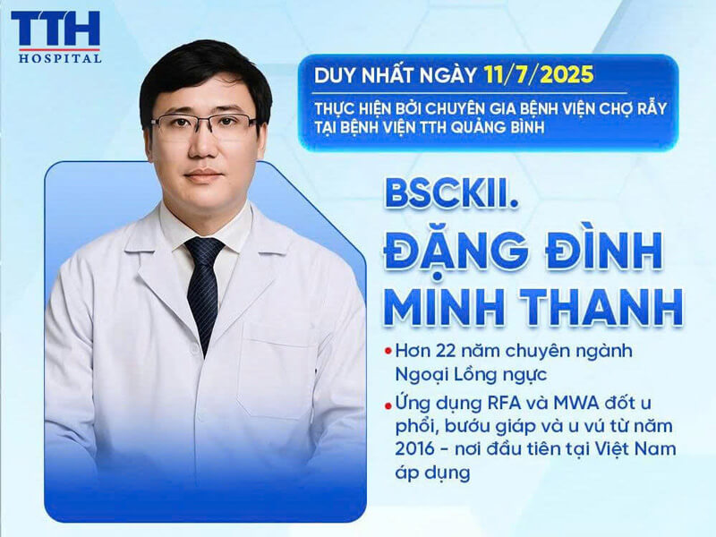 BSCKII Đặng Đình Minh Thanh là người tiên phong triển khai kỹ thuật đốt sóng cao tần và vi sóng trong điều trị u tuyến giáp, phổi và tuyến vú tại Việt Nam từ năm 2016. Với hơn 22 năm kinh nghiệm trong lĩnh vực ngoại khoa, bác sĩ đã trực tiếp điều trị thành công cho hàng ngàn ca bệnh, giúp bệnh nhân bảo tồn được thẩm mỹ, hạn chế xâm lấn và rút ngắn đáng kể thời gian hồi phục.