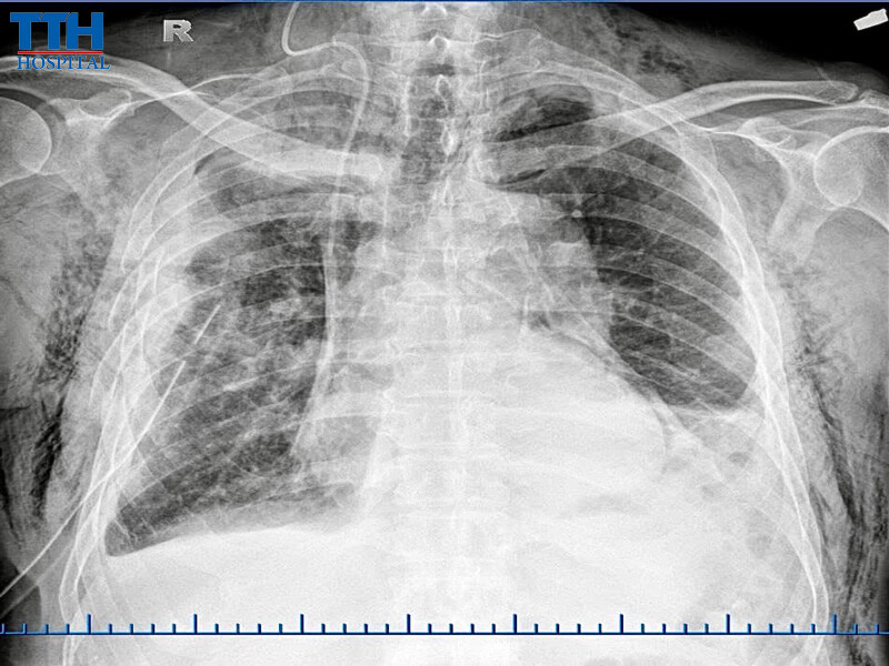 • Có khối máu tụ lớn trong khoang màng phổi và dưới màng phổi phải, chiếm gần một nửa khoang lồng ngực, gây cản trở sự nở tối đa của phổi.