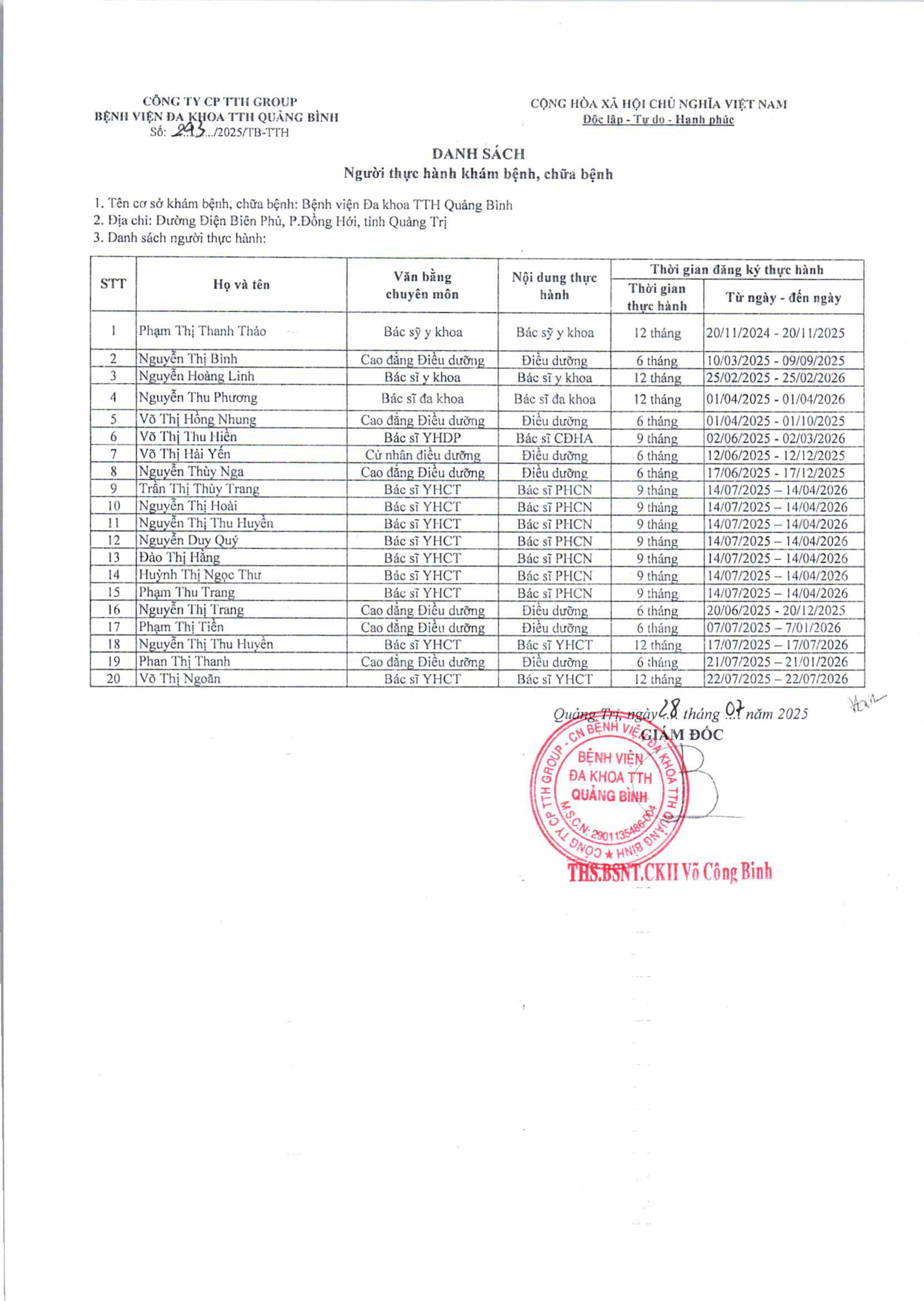 DANH SÁCH NGƯỜI THỰC HÀNH KHÁM CHỮA BỆNH TẠI CƠ SỞ TÍNH TỚI THÁNG 07/2025 CÓ THỂ BẠN QUAN TÂM LỚP HỌC TIỀN SẢN MIỄN PHÍ THÁNG 10 17-10-2025 KHÁM THAI ĐỊNH KỲ VÀ VƯỢT CẠN TẠI TTH QUẢNG BÌNH 14-10-2025 THAY KHỚP GỐI NHÂN TẠO - KHỞI ĐẦU HÀNH TRÌNH MỚI CHO NHỮNG ĐÔI CHÂN ĐÃ MỎI 11-10-2025