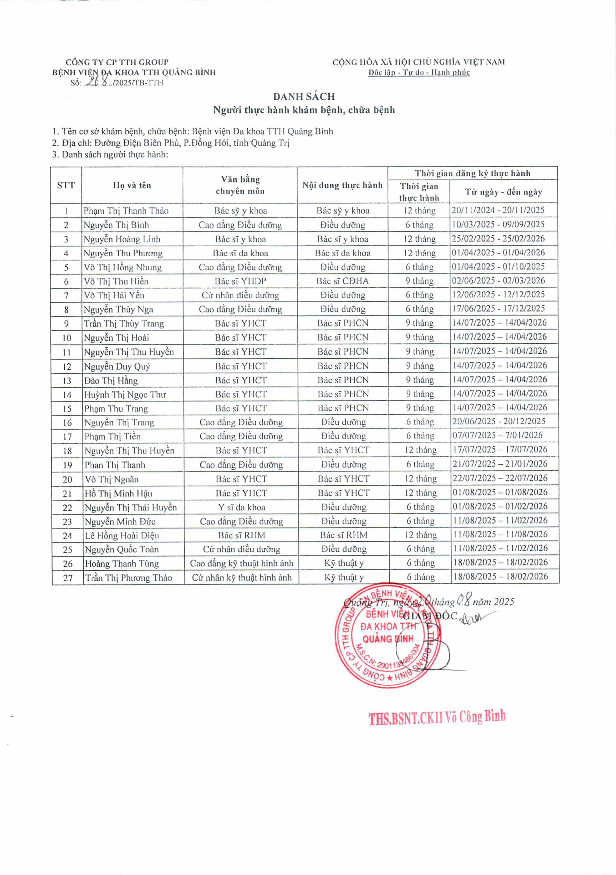 DANH SÁCH NGƯỜI THỰC HÀNH KHÁM CHỮA BỆNH TẠI CƠ SỞ TÍNH TỚI THÁNG 08/2025 CÓ THỂ BẠN QUAN TÂM LỚP HỌC TIỀN SẢN MIỄN PHÍ THÁNG 10 17-10-2025 KHÁM THAI ĐỊNH KỲ VÀ VƯỢT CẠN TẠI TTH QUẢNG BÌNH 14-10-2025 THAY KHỚP GỐI NHÂN TẠO - KHỞI ĐẦU HÀNH TRÌNH MỚI CHO NHỮNG ĐÔI CHÂN ĐÃ MỎI 11-10-2025