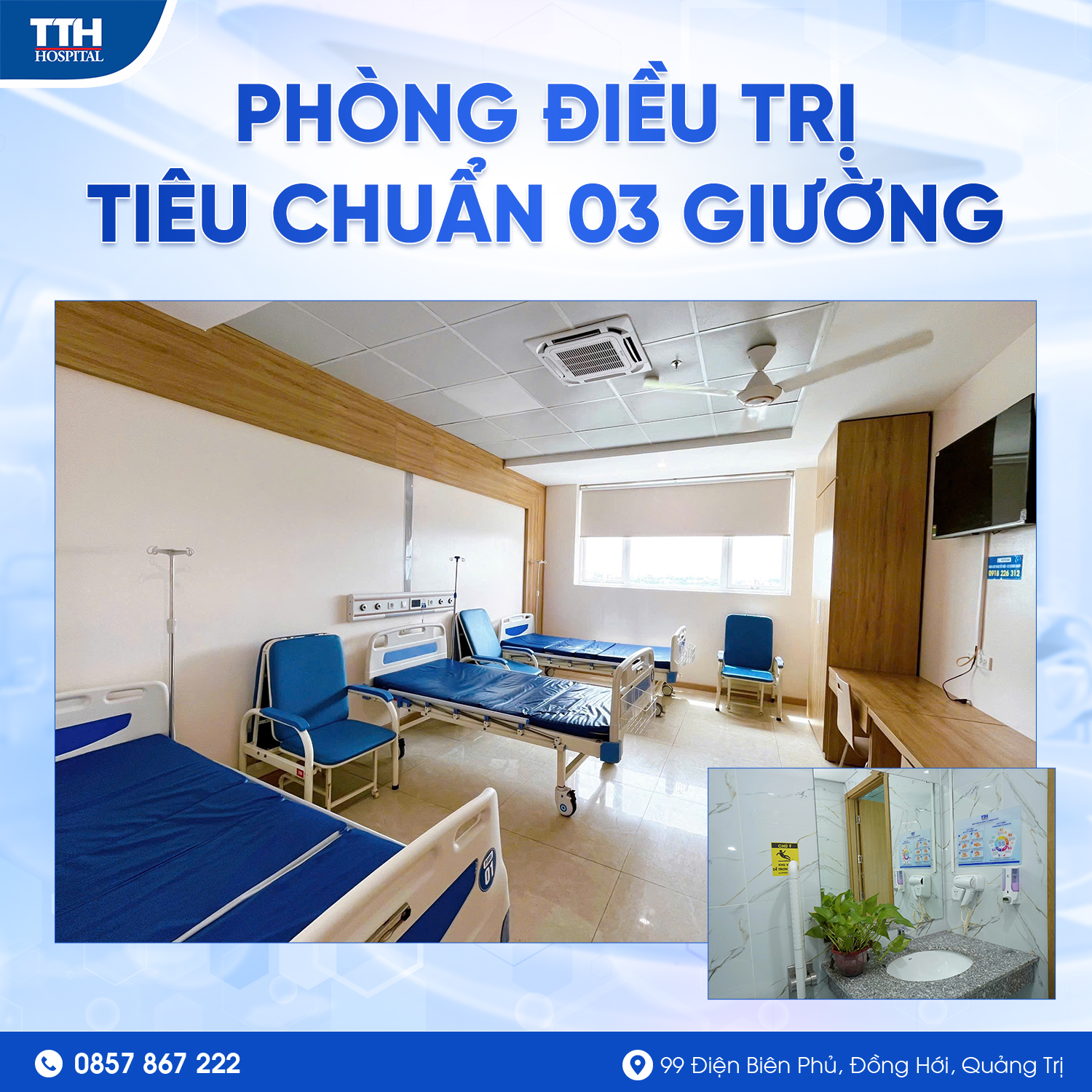Trong bối cảnh nhu cầu chăm sóc sức khỏe ngày càng cao, việc đảm bảo chất lượng buồng bệnh nội trú đóng vai trò then chốt trong việc nâng cao hiệu quả điều trị và trải nghiệm của người bệnh. Tại Bệnh viện Đa khoa TTH Quảng Bình, các tiêu chuẩn về buồng bệnh nội trú không chỉ được xây dựng theo quy định chung của TTH Group mà còn được chú trọng cải tiến theo hướng hiện đại, tiện nghi và thân thiện. Từ cơ sở vật chất, trang thiết bị đến quy trình vệ sinh, kiểm soát nhiễm khuẩn và chăm sóc người bệnh, tất cả đều hướng tới mục tiêu mang lại môi trường điều trị an toàn và hiệu quả. Dưới đây là hình ảnh giới thiệu chi tiết về các tiêu chuẩn buồng bệnh nội trú đang được áp dụng tại Bệnh viện Đa khoa TTH Quảng Bình.