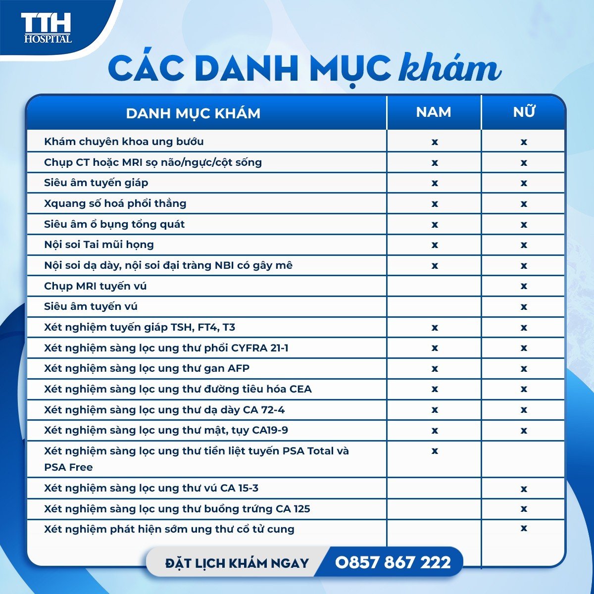 - Các xét nghiệm tìm dấu ấn ung thư: CA 15-3 phát hiện nguy cơ ung thư tuyến vú, CA 125 phát hiện nguy cơ ung thư buồng trứng, xét nghiệm tế bào âm đạo Pap smear/ Thinprep phát hiện sớm ung thư cổ tử cung, CYFRA 21-1 chẩn đoán ung thư phổi, AFP tầm soát ung thư gan, CEA phát hiện nguy cơ ung thư đường tiêu hóa, CA 72-4 phát hiện nguy cơ dạ dày, CA19-9 phát hiện nguy cơ ung thư mật, tụy.