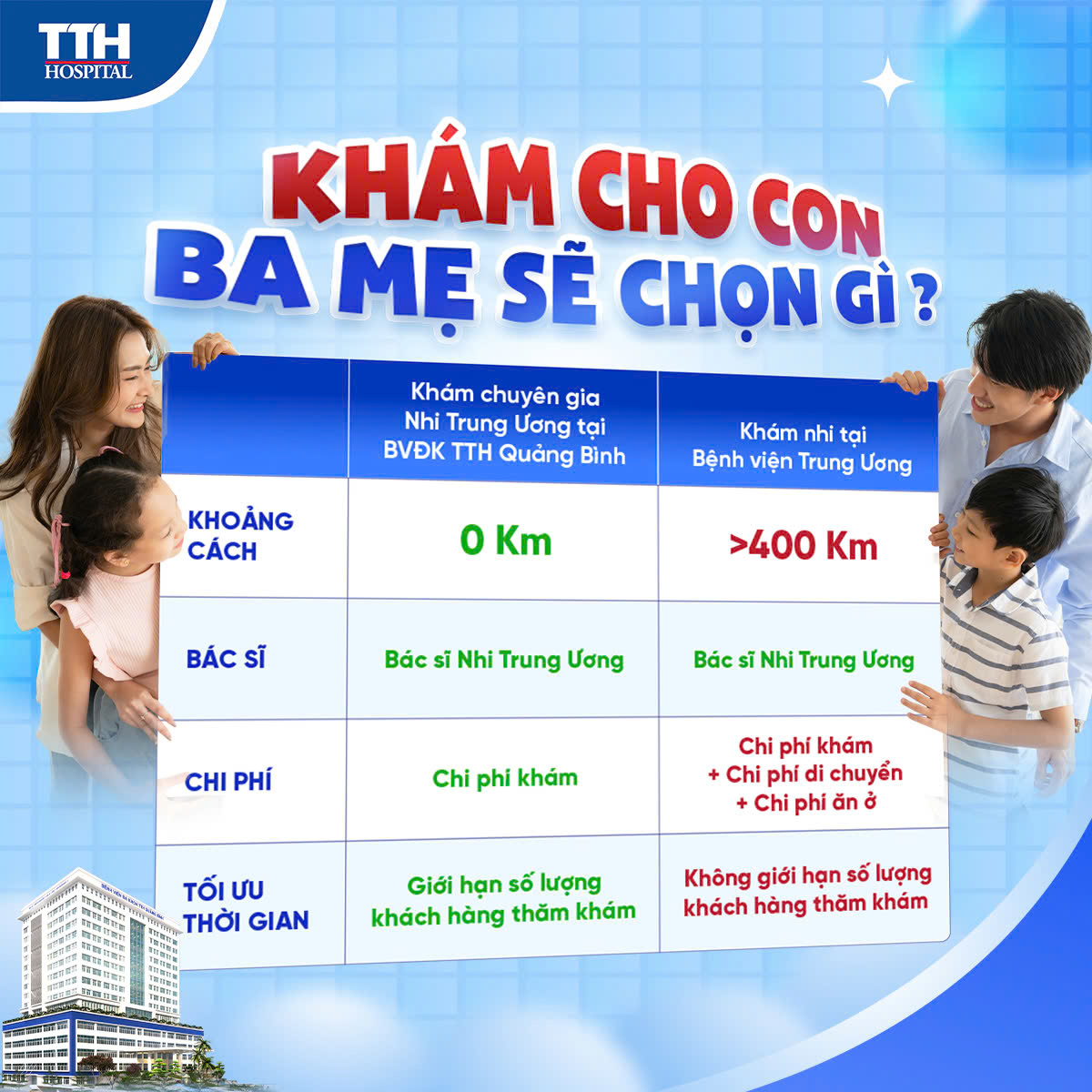 Ba mẹ đã biết tin gì chưa? Giờ đây, nhà mình không cần phải đi xa, vì bé đã được thăm khám với chuyên gia Nhi Trung Ương ngay tại Bệnh viện Đa khoa TTH Quảng Bình! So với khám tại Bệnh viện Trung Ương, lựa chọn khám tại Bệnh viện Đa khoa TTH Quảng Bình sẽ giúp ba mẹ tiết kiệm chi phí, thời gian và vẫn đảm bảo cho con yêu được hưởng dịch vụ y tế chất lượng.