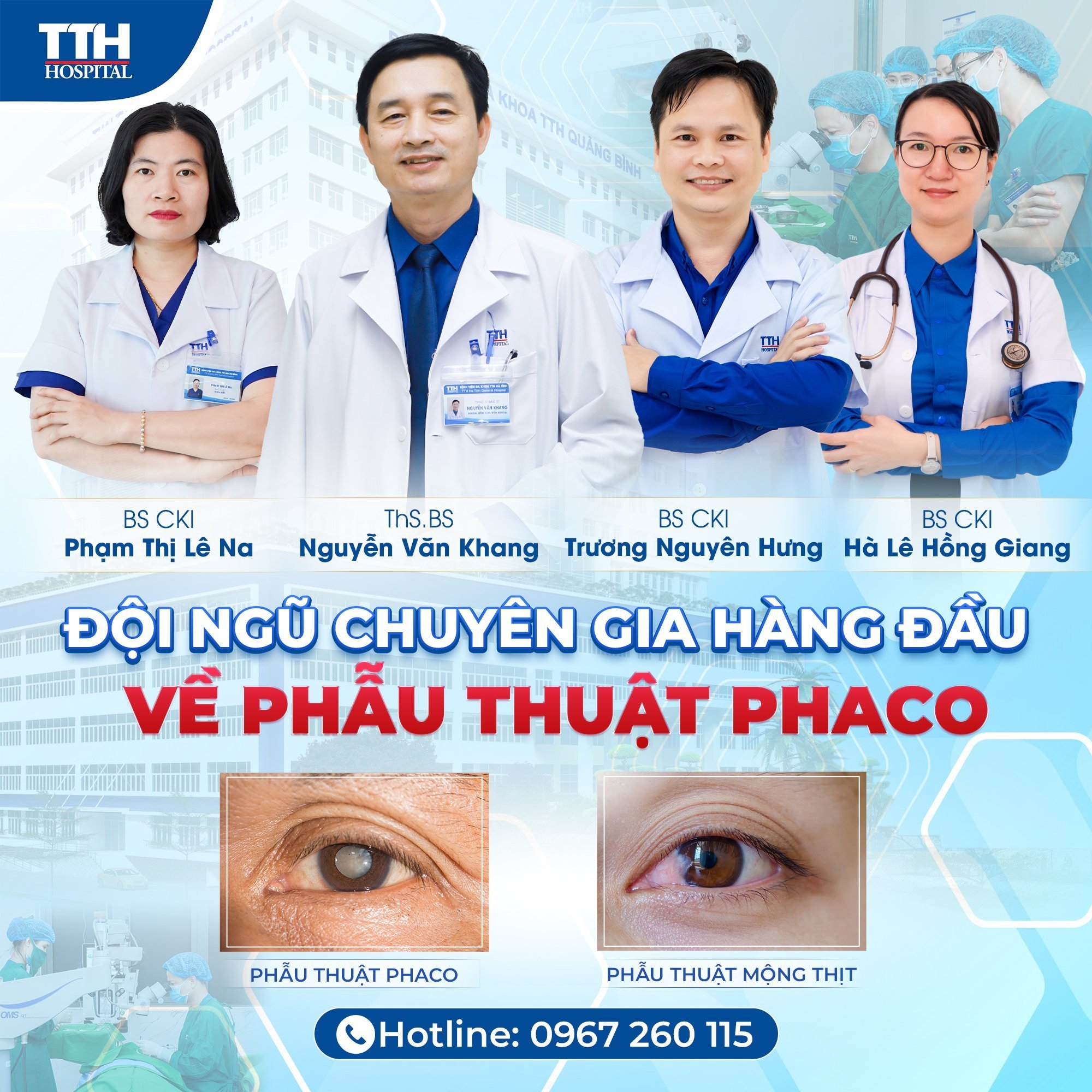 Khoa Mắt - Bệnh viện Đa khoa TTH Quảng Bình là địa chỉ tin cậy trong việc thăm khám, chẩn đoán và điều trị các bệnh lý về mắt như Phẫu thuật Phaco điều trị Đục thủy tinh thể, Phẫu thuật điều trị mộng thịt với: