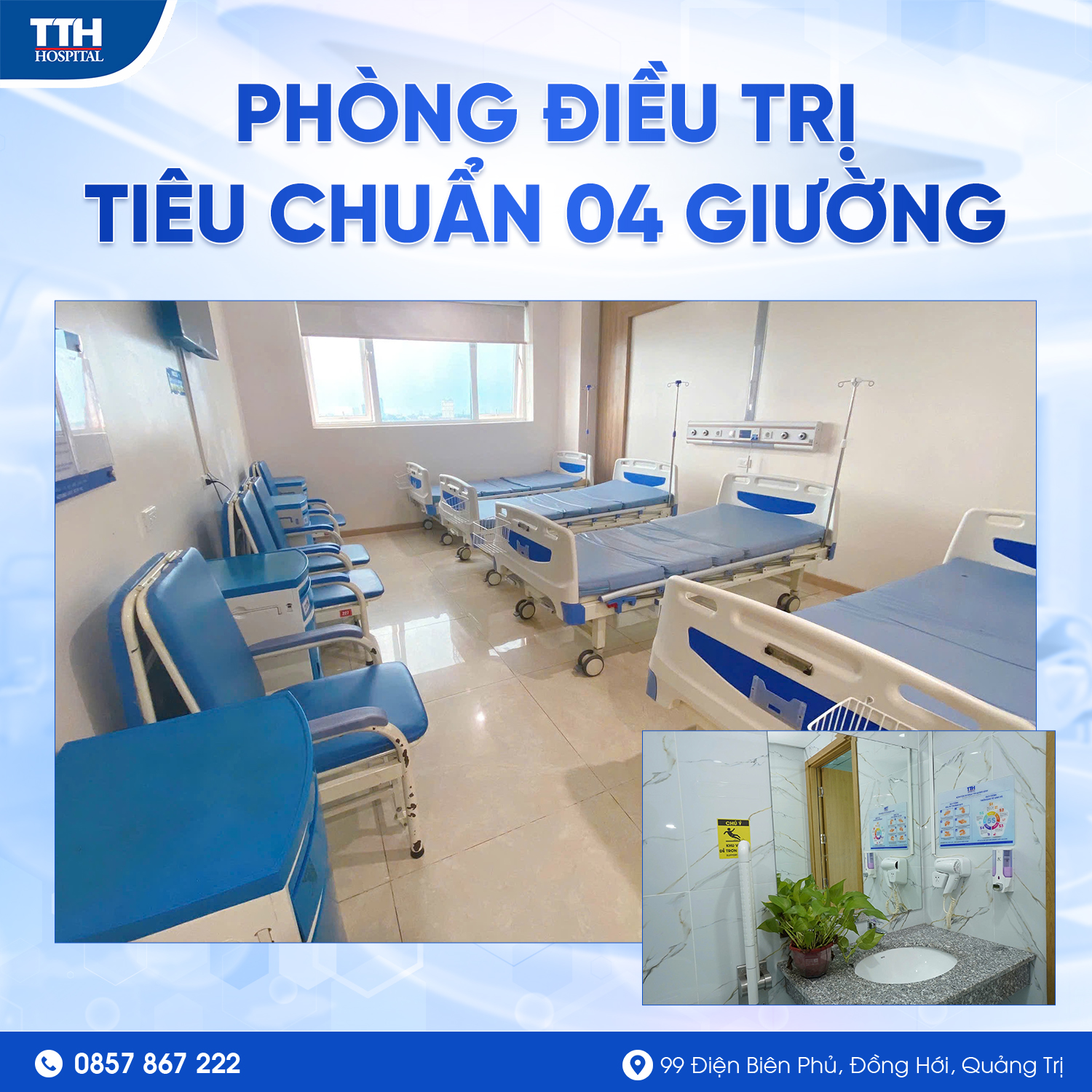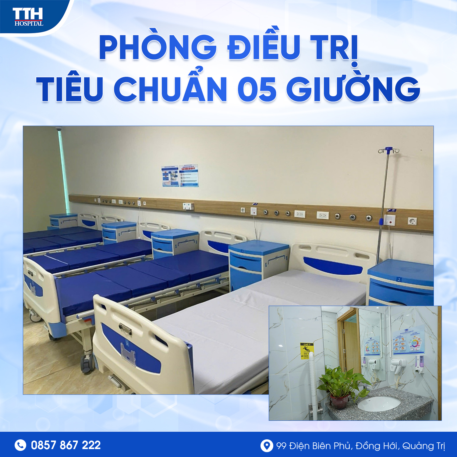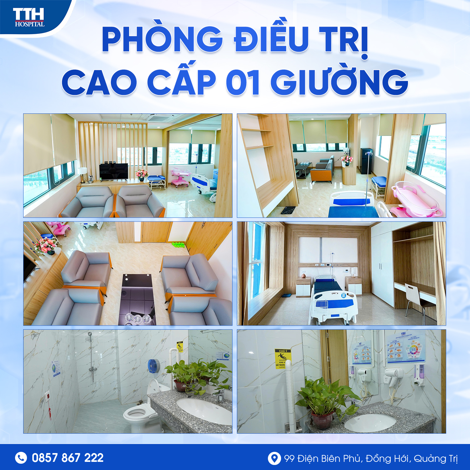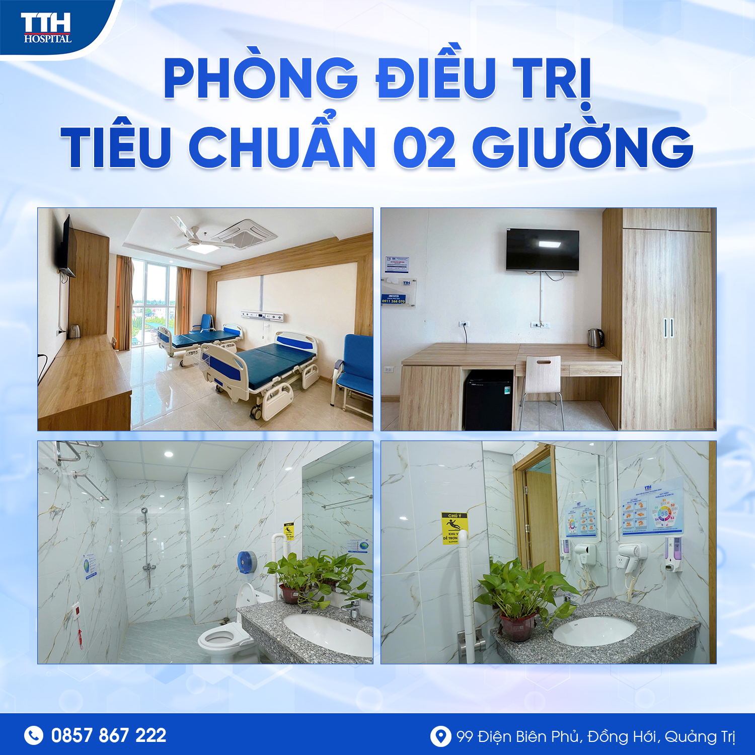 Trong bối cảnh nhu cầu chăm sóc sức khỏe ngày càng cao, việc đảm bảo chất lượng buồng bệnh nội trú đóng vai trò then chốt trong việc nâng cao hiệu quả điều trị và trải nghiệm của người bệnh. Tại Bệnh viện Đa khoa TTH Quảng Bình, các tiêu chuẩn về buồng bệnh nội trú không chỉ được xây dựng theo quy định chung của TTH Group mà còn được chú trọng cải tiến theo hướng hiện đại, tiện nghi và thân thiện. Từ cơ sở vật chất, trang thiết bị đến quy trình vệ sinh, kiểm soát nhiễm khuẩn và chăm sóc người bệnh, tất cả đều hướng tới mục tiêu mang lại môi trường điều trị an toàn và hiệu quả. Dưới đây là hình ảnh giới thiệu chi tiết về các tiêu chuẩn buồng bệnh nội trú đang được áp dụng tại Bệnh viện Đa khoa TTH Quảng Bình.